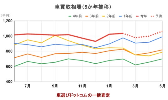 車選びドットコムの予測では、今後、新生活需要の落ち着く3月を底に回復したあとは、夏に向けて上昇傾向が続くと見込まれます。