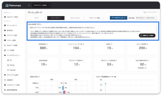 プラチナラリーにはダッシュボード機能が搭載されており、スタンプラリー参加者のユーザー数や属性、回遊率などのデータを集計し、可視化することができます。しかし、従来のダッシュボードでは数値やグラフとして表示されるだけで、それらの情報を分析・解釈するのは運営者の負担となっており、多くの時間とコストがかかっていました。