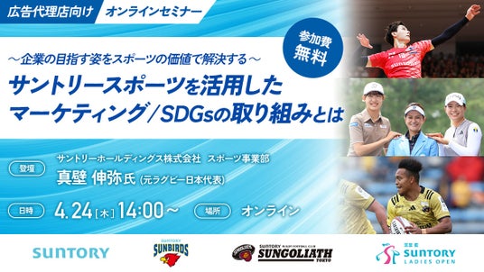 この度、サントリーサンバーズ大阪(サントリーホールディングス(株)スポーツ事業部)では、4月24日(木)14:00~「~企業の目指す姿をスポーツの価値で解決する~ サントリースポーツを活用したマーケティング/SDGsの取り組みとは」と題した、広告代理店向けオンラインセミナーを開催いたします。