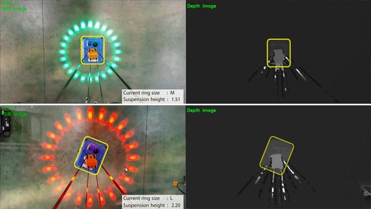 「クレーン作業安全支援システム」は、点円環型光パターン形成LED照明「ホロライト・ドットリング」と「AIカメラ・センシング技術」を組み合わせた、天井クレーン向けの安全対策製品です。今回、ホロライト・ドットリングが形成する円環の大きさを可変できる点円環切替型光パターン形成LED照明「ホロライト・ドットリング・スイッチ」を開発しました。本装置は、外部制御信号によって円環の大きさを小(S型)、中(M型)、大(L型)の3種類に切り替えることができ、さらに 青・緑・赤 の照明色を選択できます。また、AIカメラを活用して吊荷の大きさと高さ情報をセンシングすることで、退避距離を示す円環の大きさをリアルタイムに切り替えできます。これにより、異なるサイズの吊荷を扱う環境でも適切な退避距離を明示でき、安全性の向上と作業効率の改善が期待されます。