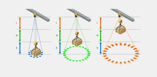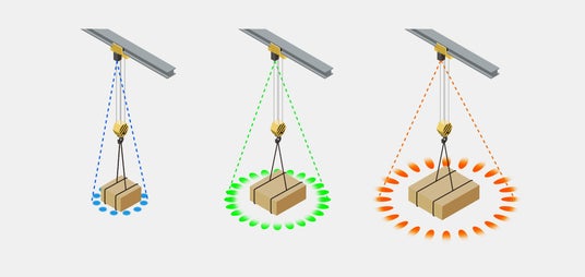 点円環切替型光パターン形成LED照明「ホロライト・ドットリング・スイッチ」と 「AIカメラ・センシング技術」を組み合わせることで、吊荷のサイズや高さに応じて3種類の大きさの点円環状の光を自動で切り替え、吊荷周辺の退避距離を光で明示できます。これにより、周囲の作業者へ直感的に注意喚起でき、安全性の向上に貢献します。