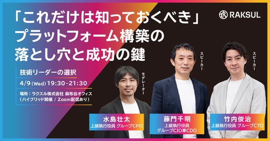 ラクスル株式会社(本社:東京都港区、代表取締役社長 グループCEO:永見世央、以下:当社)は、4月9日に、プラットフォーム構築に関心のある技術者やリーダー向けのイベントを開催いたします。