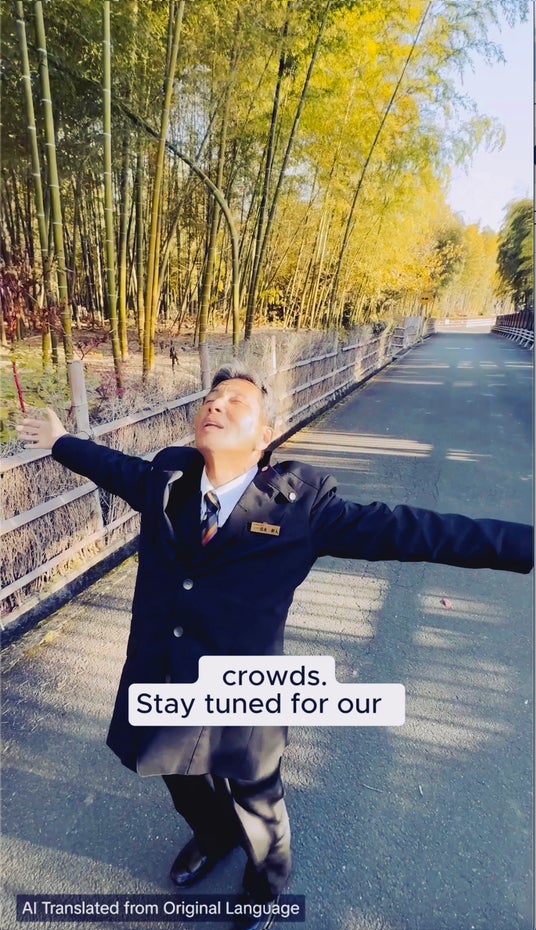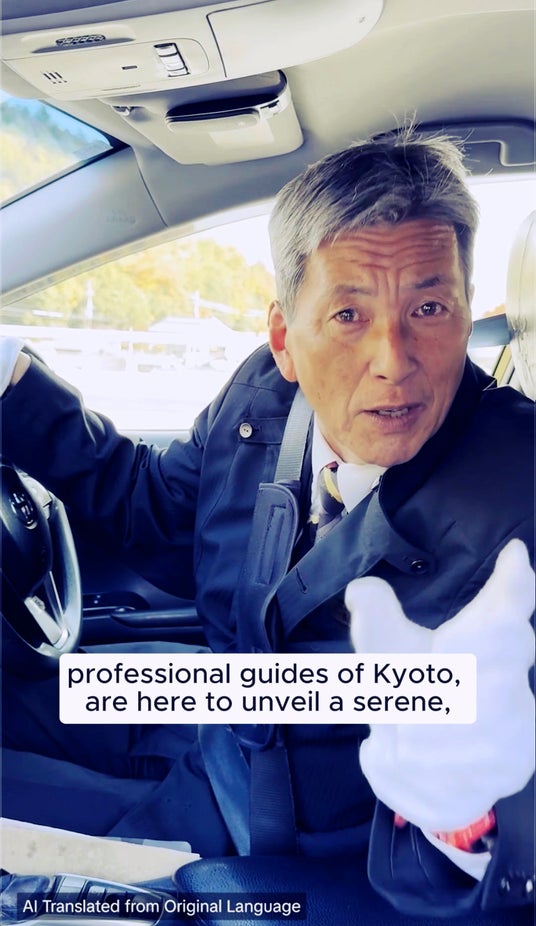 ショートムービープラットフォーム「TikTok」に開設した新アカウント「UNOFFICIAL TOURISM」では、京都の通な情報を知り尽くした60代のベテランドライバーが動画に出演し、なんと英語やスペイン語、フランス語など15の言語で話して観光スポットを紹介します。実はこれはTikTokの広告配信サービスを提供しているTikTok for Businessの、生成AIを活用した新たなクリエイティブソリューション「TikTok Symphony」の翻訳・吹き替え機能を活用したもの。撮影時、ドライバーたちは日本語しか話していませんが、この機能を活用することでドライバー自身の声で他言語を話しているような動画が完成しました。