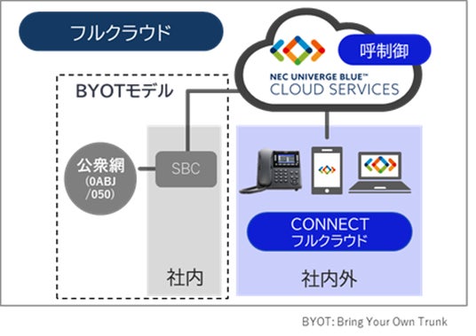 NECプラットフォームズは、音声通話・チャット・Web会議・ファイル共有などオフィスコミュニケーションに必要な機能を統合したクラウドサービス「UNIVERGE(ユニバージュ) BLUE」において、オンプレミス型PBXやキーテレフォン(注1)の初期導入コストを抑えたフルクラウド構成のBring Your Own Trunkモデル(注2、以下BYOTモデル)を本年4月25日から提供を開始します。