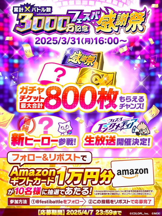 イベント開催を記念して、『フェスバ+』公式X(https://x.com/festibattle)ではAmazonギフトカード1万円分が抽選で10名様にあたるリポストキャンペーンを開催しています。ぜひ奮ってご参加ください。
