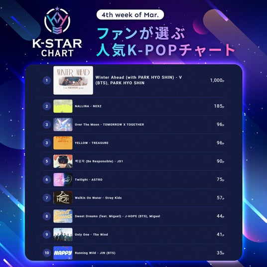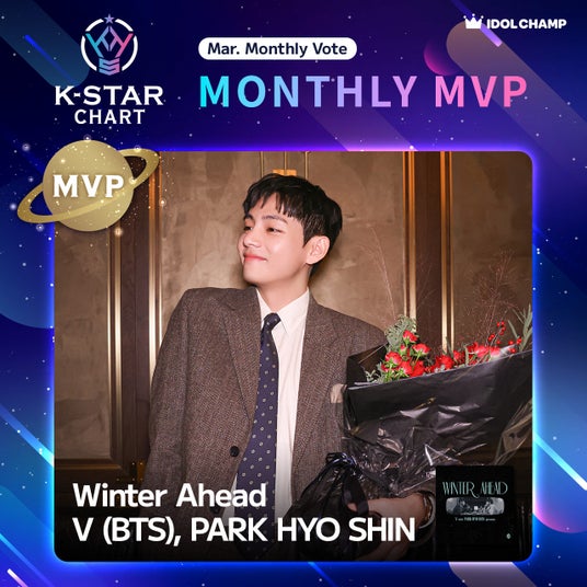 『K-STAR CHART presents POP-K TOP10 Friday』週間チャートの投票数をベースに算出された3月の累計ポイント数で決まる月間チャート1位は V (BTS), PARK HYO SHINの「Winter Ahead (with PARK HYO SHIN)」となり3月のMVPとして番組内で放送されました。