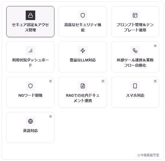 2025年6月下旬を目途に、画像生成機能やWeb検索機能などの新機能を順次提供する予定です。さらに、AIエージェント機能やRAG(Retrieval Augmented Generation)など、企業のAI活用を一層推進する機能の追加・拡充も視野に入れております。これにより、マーケティングや営業支援、業務効率化など、幅広い業務領域での生成AI活用を実現し、企業のイノベーション創出と競争力強化に貢献してまいります。