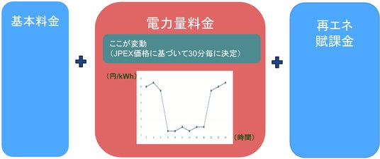 価格連動型料金では、日本卸電力取引所(JEPX)の市場価格に応じて電気代が低い時間帯にEV充電を実施します。JEPXで30分ごとに決定する価格に基づいて、EVの充電料金が決まります。30分単位で価格が変動するため、価格が低い時間帯を選ぶことで充電を最適化します。