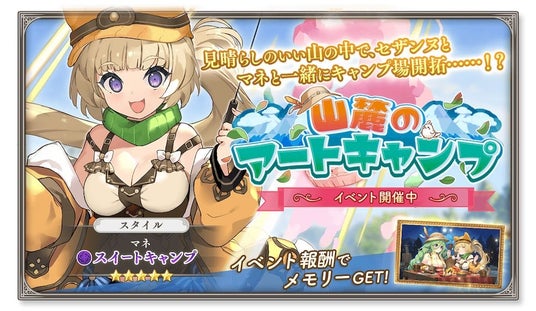 合同会社EXNOA(本社:東京都港区、CEO:村中 悠介、URL:https://games.dmm.com/)が運営するDMM GAMESにおいて、「クリエイティブチーム くまさん」第4弾作品となる『ガールズクリエイション -少女藝術綺譚-』(以下、『ガールズクリエイション』)にて、イベント「山麓のアートキャンプ」を開催いたしました。また、マネ★5スタイル【スイートキャンプ】とセザンヌ★5スタイル【アートキャンパー】が新登場のピックアップガチャの開催もお知らせいたします。