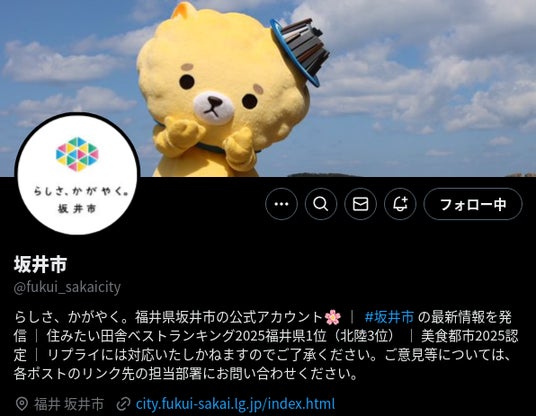 福井県坂井市の最新情報や旬の話題など、市政や市の魅力に関する様々な情報をタイムリーに発信することにより、坂井市をより身近に感じていただくことを目的として、公式Xを開設しました。令和7年4月1日より、運用開始します。Xを運用することで、市の公式SNSは「Instagram」「Facebook」「LINE」「YouTube」「note」に続いて6つ目となります。