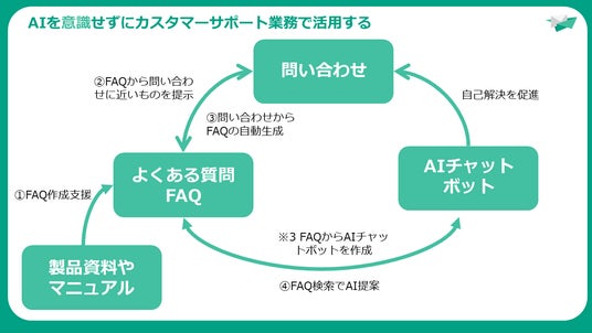 直近でもカスタマーサポート現場で発生する「よくある質問」をFAQにまとめ、それをAIチャットボットが回答していくAIチャットボットを2024年6月(*3)にリリース、FAQの更新がそのままAIチャットボットの活用につながる機能となっています。2024年9月(*4)にはLINE公式アカウント、2025年3月にはSlackへの連携を展開し、プロンプトの設計や正しいデータの整備などAI利用に関するハードルを意識しない利用を提供しています。