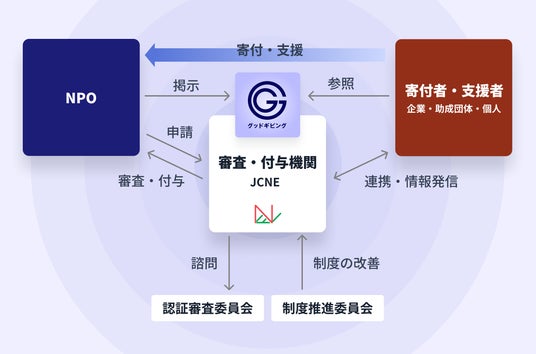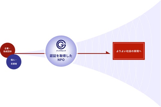 新制度ではNPOを寄付や助成金で支援したいと考えている個人、企業・団体、 助成団体、行政などに対して、信頼性の確認に必要な項目を審査し、グッドギビングマークの有無によって、パートナーシップやコラボレーションを検討する際にご活用いただくことを想定しています。