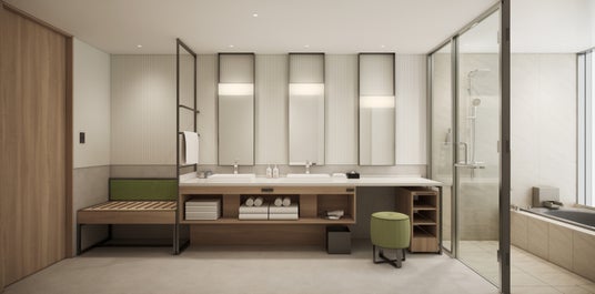 布団を2組敷くことができるゆったりとした和室スペースは、時を忘れてリゾートライフを楽しめる空間。ゴルフ場越しに雄大な山々が望めるテラスにはガーデンチェア&テーブルをご用意。天然温泉ビューバスと大町の軟水をひとりじめできるレインシャワー。ゆったりした洗面スペースはツーベイシンとパウダールームを完備。ワーケーションやホカンスにもご利用いただけます。