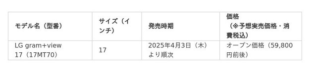 LGエレクトロニクス・ジャパン株式会社(代表取締役:孫 成周(ソン・ソンジュウ)、本社:東京都中央区)は、軽量高解像度モバイルモニター「LG gram +view」において、従来の16インチモデルに加えて、17インチの新モデル「LG gram +view 17」(型番:17MT70)を本日2025年4月3日(木)より順次発売いたします。