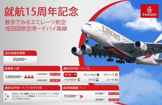 「成田国際空港就航15周年を迎えることは、日本へのサービスに対する揺るぎないコミットメントの証です」とエミレーツ航空日本支社長のサティシュ・セティ氏は述べました。「世界中を旅する何百万人ものお客さまにサービスを提供したことで皆様と強固なパートナーシップを築くことができ、皆様の信頼を得たことを誇りに思います。今後もお客様に比類なき旅行体験を提供し、増大する需要に応えるべく注力してまいります。」