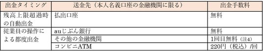- 給与としてチャージされたau PAY 給与残高は、本人名義の金融機関口座への出金や対象のATMでの出金が可能です。金融機関口座への出金が月1回目に該当する取引の場合は、出金手数料は無料です。