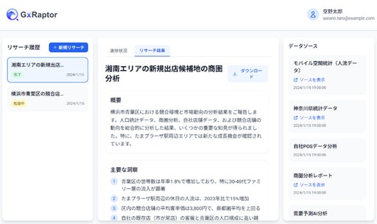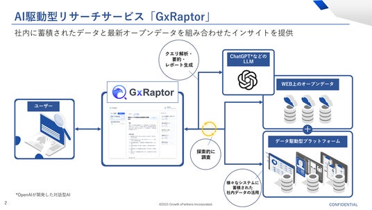 グロースエクスパートナーズ株式会社(本社:東京都新宿区、代表取締役社長:渡邉 伸一、以下 当社)は、エンタープライズ企業向けに、社内に蓄積された膨大なデータとインターネット上の最新情報を組み合わせたインサイトを提供するAI駆動型リサーチサービス「GxRaptor」を発表します。本サービスは、各企業が蓄積してきたデータ資産とAIを組み合わせることで、企業のデータ活用を促進します。