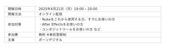 本セミナーでは、2025年3月に刊行された『Nuke教科書』の著者陣が登壇し、書籍に掲載されたトピックをご紹介します。Nuke初心者から経験者まで、幅広く学びを深めたい方におすすめの内容です。