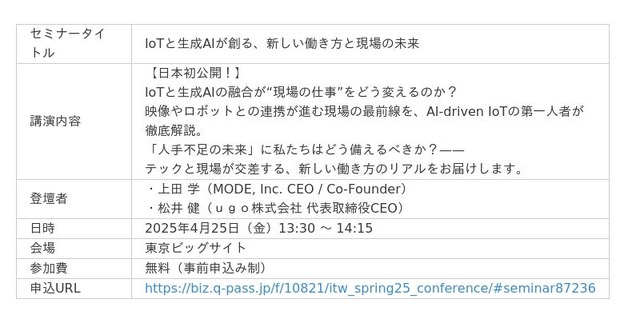 また、本提携に関連し、ugo株式会社 代表取締役CEO 松井 健氏が、2025年4月25日(金)に開催される「Japan IT Week 春展」のセミナーに登壇することが決定しました。