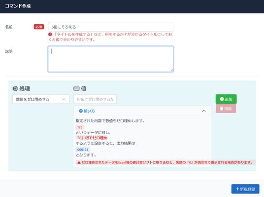 CSVやフィードのルール作成時に利用可能なコマンドに数値をゼロ埋めする機能を追加いたしました。この機能を利用することで出力先の数値入力に桁数指定がある場合に不足分を「0」で埋める事が可能になります。例えば、出力先の桁数が6桁に指定されていて元データが「123」と入力されていても、6桁でゼロ埋めすると「000123」と6桁に変換して出力します。