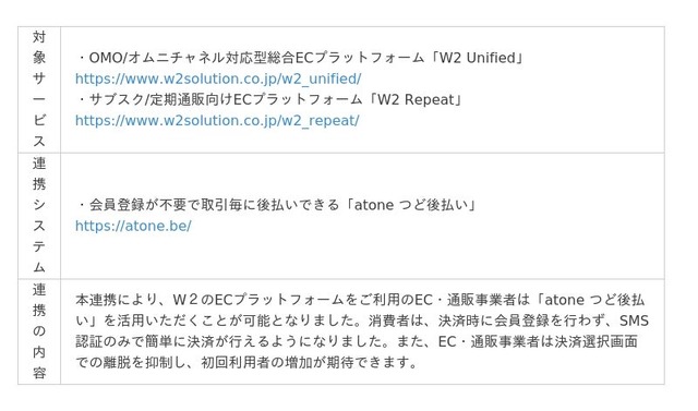 EC事業の「成功」にこだわる最先端ECプラットフォームを展開するW2株式会社(本社:東京都中央区、代表取締役:山田大樹、以下W2)は、株式会社ネットプロテクションズ(所在地:東京都千代田区、代表取締役社長:柴田 紳、以下ネットプロテクションズ)が提供する会員登録が不要で取引毎に後払いできる「atone つど後払い」と連携したことをお知らせします。この連携により、消費者は後払い決済時に会員登録を行わず、SMS認証のみで簡単に決済が行えるようになりました。また、EC・通販事業者は決済選択画面での離脱を抑制し、初回利用者の増加が実現できます。