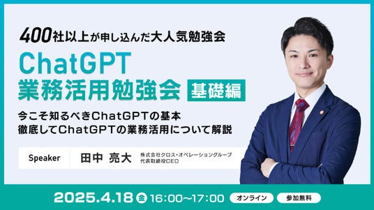 ChatGPTの基礎から、具体的なビジネス活用事例までを分かりやすく解説する勉強会を開催します。すでに400人以上が受講し、その効果を実感しています。ChatGPTをビジネスのインフラとして活用し、業務効率化を図りたい方は、ぜひご参加ください。