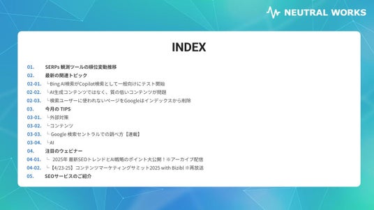 株式会社ニュートラルワークス(本社:神奈川県藤沢市、代表取締役:三木五月、以下「ニュートラルワークス」)は、自社の専門領域である、データ分析を活用した成果に繋げるためのSEO(検索エンジン最適化)に関する最新動向をまとめた「SEOトレンドレポート2025年4月号」を公開いたしました。