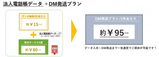 法人電話帳ですと、1企業あたり約95円でデータの入手とDM発送まで可能でございます。