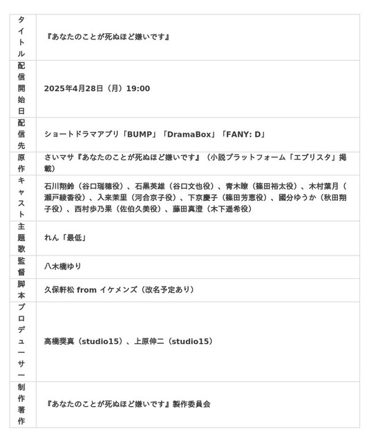 TikTokを中心としたショートムービー領域で広告代理店事業・プロダクション事業を展開するstudio15株式会社(本社:東京都渋谷区、代表取締役:岩佐琢磨、以下「studio15」)は、さいマサ氏の同名小説を原作としたショートドラマ『あなたのことが死ぬほど嫌いです』を4月28日(月)から配信します。