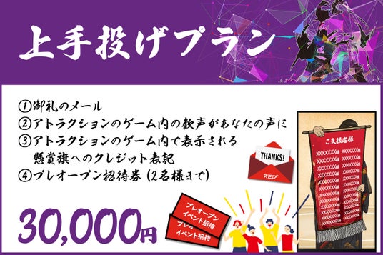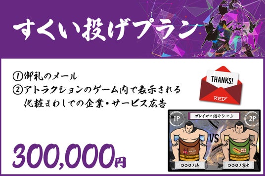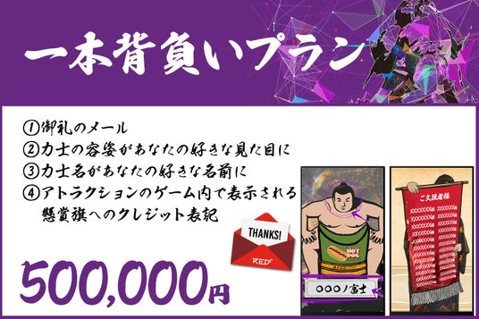 ご自身の声がアトラクションの歓声として採用されるプラン、懸賞旗や化粧まわしに企業・サービス広告を掲出可能なプランなど、相撲アトラクションと絡めた特別なリターンも多数ご用意しております。