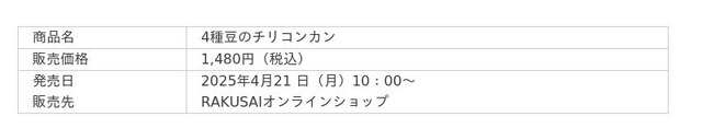 d130004-80-ca8163bb8304fbe8dd1dcf19dc824caf.pdf 楽彩株式会社(本社:東京都足立区/代表取締役社長:大崎善保)は、4月21日(月)より、熊谷喜八シェフ監修『4種豆のチリコンカン』をRAKUSAIオンラインショップにて販売開始いたします。本商品は、スパイスの香り豊かな特製ソースで4種の豆を煮込んだメキシコの定番料理チリコンカンをご家庭で手軽にお楽しみいただけるミールキットです。豆の食感と特製ソースの奥深い味わいが特徴で、パンやご飯にのせたり、様々な料理にアレンジしたりと、手軽に本格的な味をお楽しみいただける逸品です。