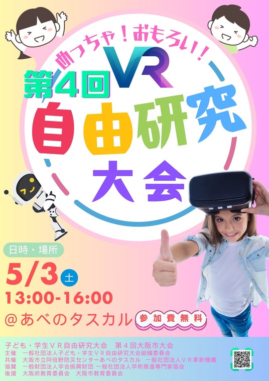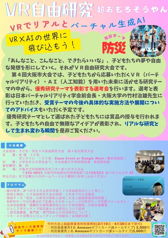 2025年5月3日(日・祝)、大阪市立阿倍野防災センター「あべのタスカル」にて、全国の小学生から大学生までを対象にした「子ども・学生VR自由研究大会 第4回大阪市大会」を開催します!