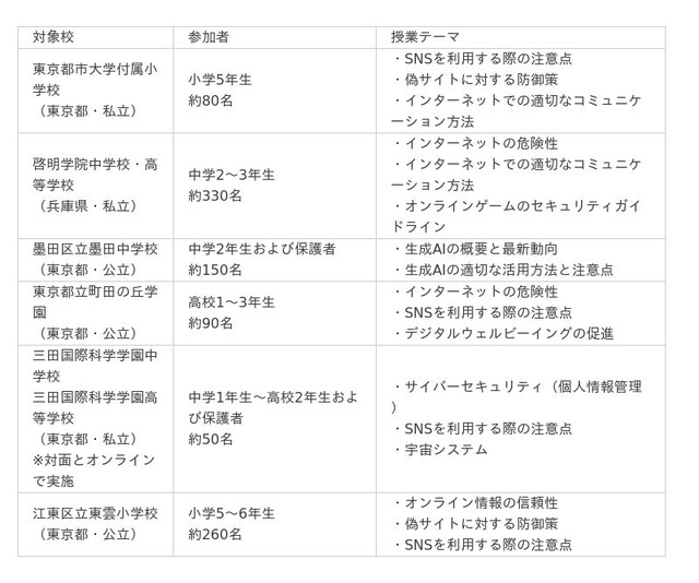 この度は2024年から2025年にかけて、有限責任 あずさ監査法人(本部:東京都新宿区)、株式会社KPMG FAS(本社:東京都千代田区)と連携して、主にインターネットの危険性、SNSや生成AIを活用する際の注意点などをテーマに、東京都と兵庫県内の小中高校計6校で実施しました。全14授業を通じて合計1,200名を超える小中高生および保護者が参加しました。