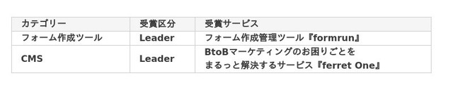 株式会社ベーシック(東京都千代田区、代表取締役:秋山勝、以下「当社」)は、アイティクラウド株式会社(東京都港区、代表取締役社長:⿊野源太)が主催するアワード「ITreview Grid Award 2025 Spring」において、当社が提供する フォーム作成管理ツール『formrun(フォームラン)』とBtoBマーケティングのお困りごとをまるっと解決するサービス『ferret One(フェレットワン)』の2サービスについて、「フォーム作成ツール」「CMSカテゴリー」のそれぞれで、満足度・認知度ともに優れた製品であると評価され、「Leader」を同時受賞したことをお知らせいたします。