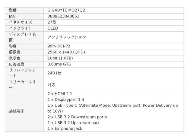 GIGABYTE MO27Q2 | GIGABYTE(ギガバイト) 27インチ QHD (2560 x 1440) 有機EL(OLED) ゲーミングディスプレイ/モニター