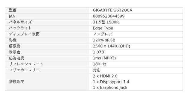 『GIGABYTE GS32QCA』は、QHD解像度(2560x1440)の31.5インチ曲面ゲーミングモニターです。