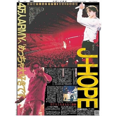 スポーツ報知を発行する報知新聞社(代表取締役社長・依田裕彦)は4月19、20日に開催されたJ-HOPEのさいたまスーパーアリーナ公演を記念しJ-HOPEを特集した特別1面新聞を販売しました。19日に販売された特別1面新聞(前編)と20日に発売された特別1面新聞(後編)、ライブの模様が芸能面に収録された21日付の新聞をスポーツ報知Yahoo!ショップで通信販売します。税込160円プラス送料で、特別紙面ページ以外は4月19日付、20日付のスポーツ報知東京版紙面になります。現地にお越しになれなかった方もこの機会にぜひお買い求めください。