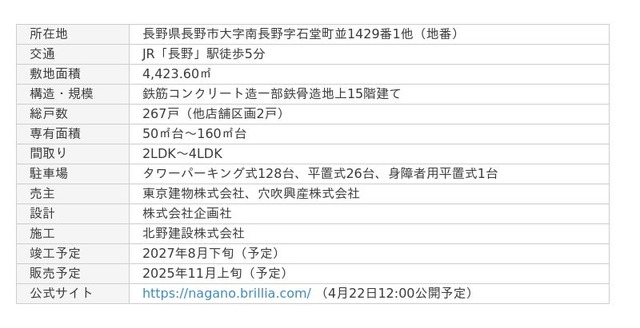 本物件は2022年7月に閉館した商業施設「ショッピングプラザagain(アゲイン)」の跡地に誕生する地上15階建て総戸数267戸の長野市内では最大規模※の分譲マンションです。東京建物の分譲マンションブランド「Brillia」としては長野県初進出となります。