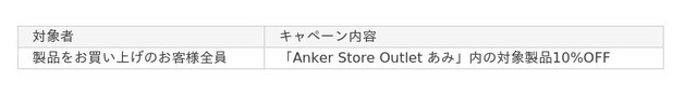 今回、オープン記念キャンペーンとして、2025年5月2日(金)~ 2025年5月11日(日)の10日間限定で「Anker Store Outlet あみ」内の対象製品を10%OFFでご購入いただけます。