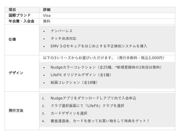 ナッジ株式会社(本社:東京都千代田区、代表取締役:沖田貴史)は、株式会社FiT(本社:京都府京都市、代表取締役:加藤恵多、以下「FiT」)と提携し、次世代クレジットカード「Nudge(ナッジ、以下「ナッジカード」)」アプリにて、「LifeFit 公式クレジットカード」の提供を4月22日(火)より開始しました。