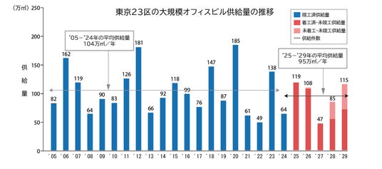 ・25年以降の5年間では、25・26・29年で100万平方メートル 超のまとまった供給があるものの、27年は過去20年間で最も少ない供給量となり、今後5年間の平均供給量は過去20年間の平均104万平方メートル を下回る95万平方メートル に留まる見込みです。