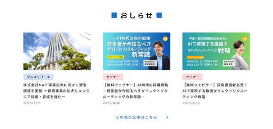 無料相談・デモ画面依頼フォームをはじめ、各ページからの問い合わせ導線を再設計。お客様のニーズに合わせてより柔軟なコミュニケーションを実現できる設計へと改善しました。また、機能追加やウェビナー情報などを発信するニュースコンテンツを新設し、採用業務やダイレクトリクルーティングに関するタイムリーな情報をお届けできるようになりました。