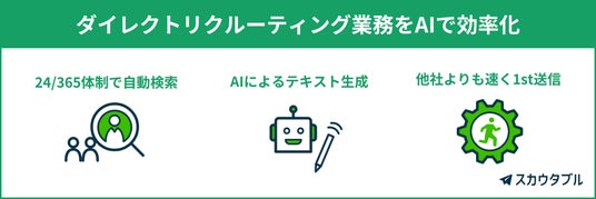 スカウタブルは、MAPが自社開発した採用業務を効率化する革新的なAI×RPAツールです。 就転職サイト上での候補者検索やスカウト文面の作成など、煩雑なダイレクトリクルーティング業務を完全自動化します。採用担当者はスカウタブルを活用することで「パソコンでの単純作業」に貴重なリソースを奪われることなく、選考実施や内定者フォローなどのコア業務に集中できます。