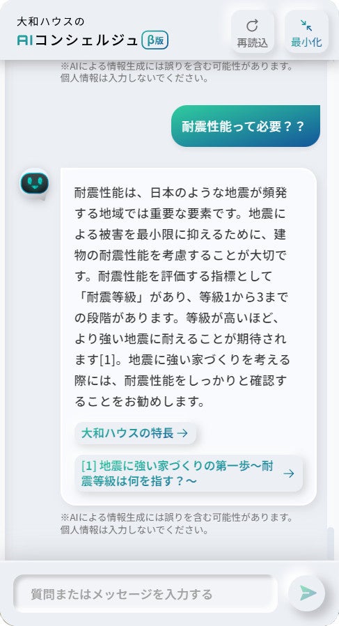 大和ハウス工業株式会社(本社:大阪市、代表取締役社長:大友浩嗣)は、本日より大和ハウスの注文住宅ホームページ内に搭載のAIチャットボット「Dコンシェ」の正式版をリリースします。