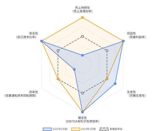 「財務ハイライト」では、経済産業省が提唱する「ローカルベンチマーク」の指標体系を基に、6つの財務指標を点数化します。レーダーチャート形式で視覚的に表示するため、企業の経営状況を多角的、かつ客観的に評価することが可能になります。