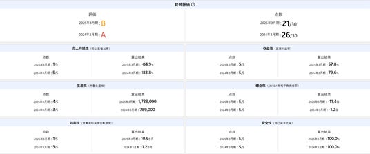 各財務指標に1~5点のスコアを付与し、その合計点に応じてA~Dの4段階で総合評価を判定します。専門的な分析を行わなくても、財務状況の健全性を直感的に把握することができます。