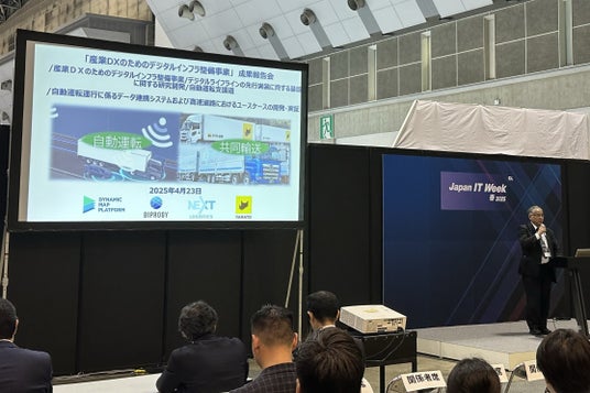 当社からはプロジェクト事業部長の石井 隆司が登壇。石井は、BIPROGY株式会社(本社: 東京都江東区、代表取締役社長: 齊藤 昇)、NEXT Logistics Japan 株式会社(本社: 東京都新宿区、代表取締役社長CEO: 梅村 幸生)、ヤマト運輸株式会社(本社: 東京都中央区、代表取締役社長: 長尾 裕)の担当者とともに、「産業DXのためのデジタルインフラ整備事業/デジタルライフラインの先行実装に資する基盤に関する研究開発」の取り組みにおいて開発した自動運転を支援するデータ連携システムや、2月25日(火)~27日(木)に実施した新東名高速道路・駿河湾沼津SA―浜松SA間での自動運転トラックによる走行実証などについてプレゼンテーションしました。