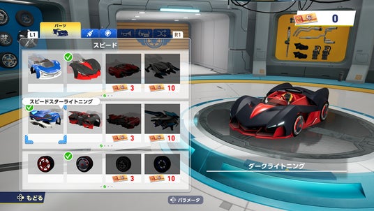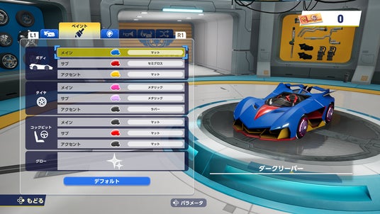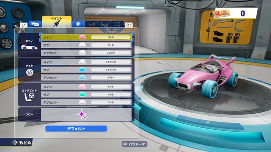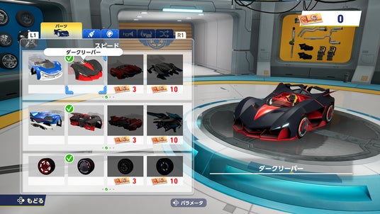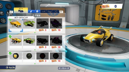 本作では、レースで使用するマシンを自由にカスタマイズすることができます。フロントパーツ/リアパーツ/タイヤのパーツ変更に加え、カラー変更やステッカーを貼ることもできます。ゲームをたくさんプレイしてチケットを集めることで、マシンパーツやガジェットが購入できます。