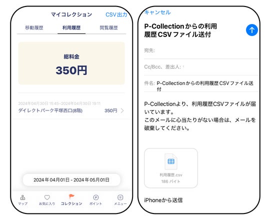 P-Collectionでは、1日~1ヶ月分の駐車場利用履歴をCSV形式で出力可能。