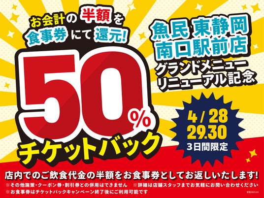 実施内容:開催期間中に「魚民 東静岡南口駅前店」の店内でご飲食されたお会計金額の半額分を当社の「お食事券」でお返しいたします。